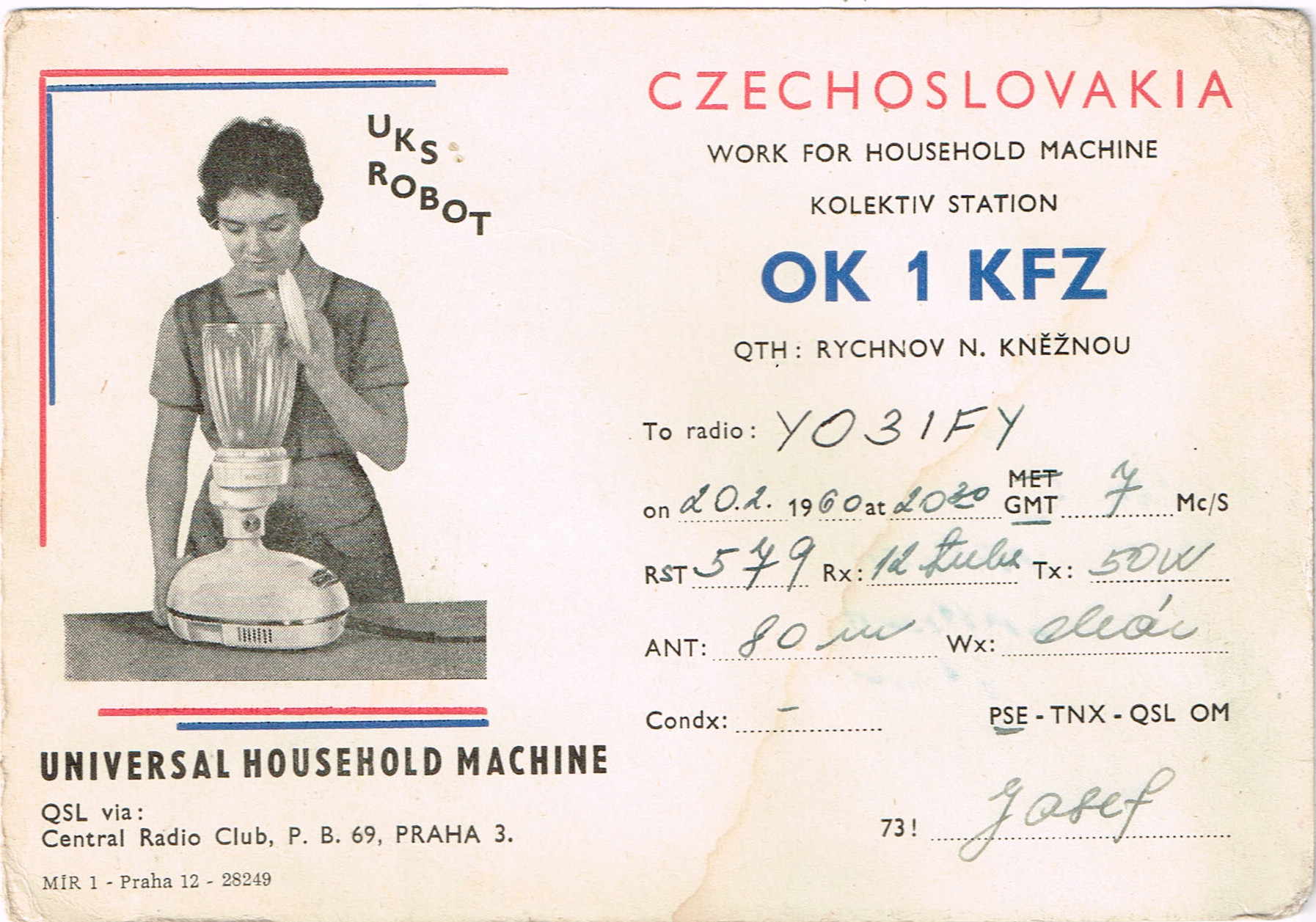 OK1KFZ către YO9IF 20 februarie 1960 7MHz