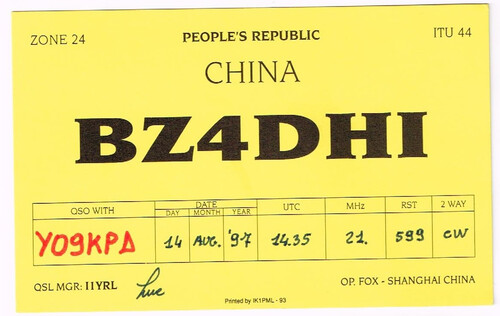 BZ4DHI to YO9KPD 11 AUGUST 1997 21MHz CW
