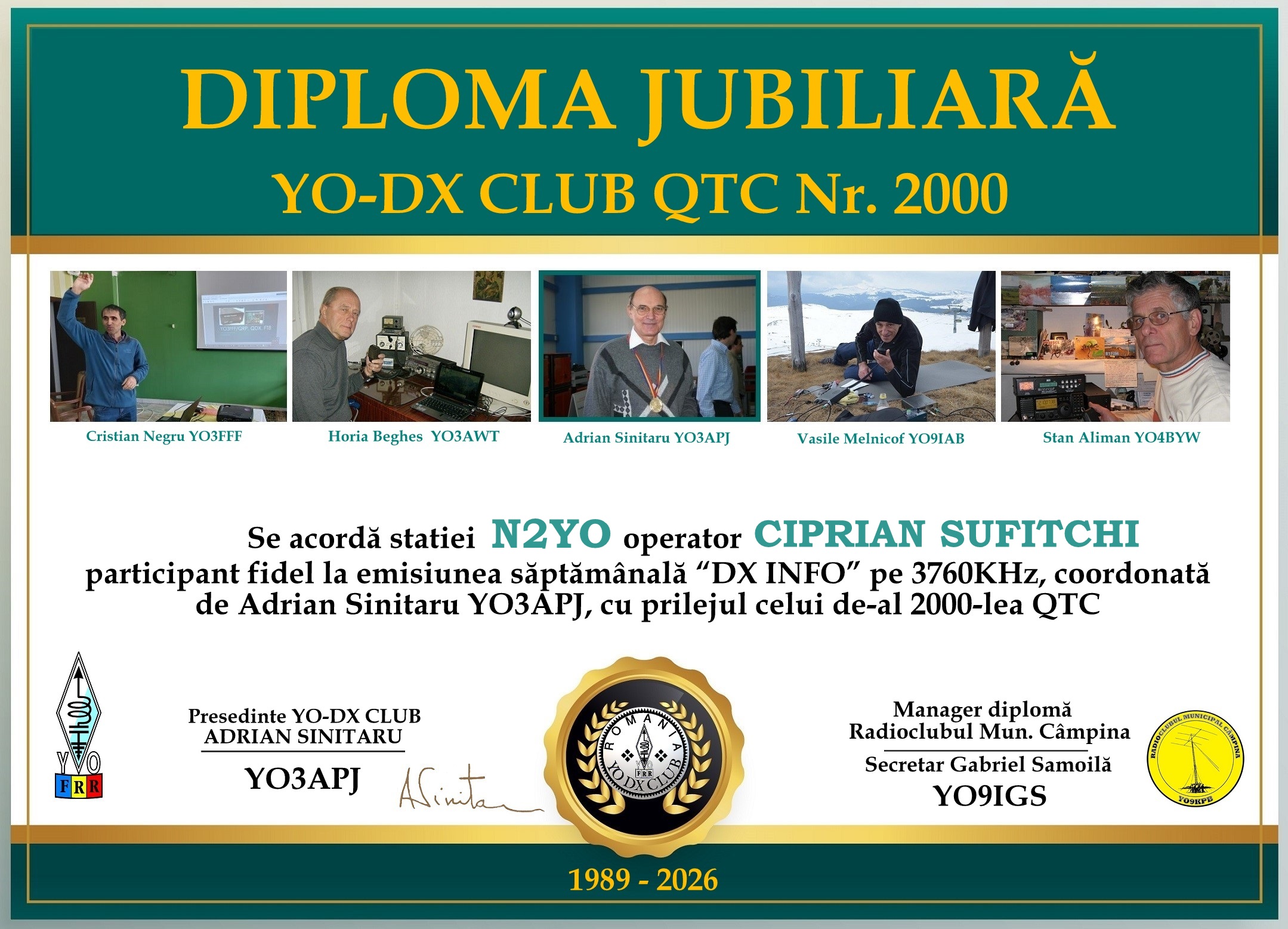YO DX CLUB este clubul de performanță în domeniul undelor scurte și ultrascurte al Federației Române de Radioamatorism. Scopurile clubului sunt: creșterea continuă a nivelului performanțelor obținute de membrii săi, ridicarea maiestriei sportive a membrilor pentru obținerea de titluri și categorii de clasificare sportivă, popularizarea peste hotare a activității radioamatorilor din Romania, stabilirea unor relații de colaborare cu alte cluburi cu același profil, din afara granițelor României și dezvoltarea unor legături de prietenie între radioamatorii români și radioamatorii din toata lumea. Emisiunea Info DX poate fi ascultată in fiecare seara de joi, la ora locala 18:00 în jurul frecvenței de 3760 kHz. În acest moment YO DX Club are 307 membri activi și 55 membri asociați. Aceasta pagină prezintă diploma jubiliară oferita participanților fideli la emisiunea Info DX cu ocazia QTC-ului Nr. 2000 - 2 aprilie 2026 Pentru a putea descărca diploma - click pe indicativ apoi click dreapta și salvează imaginea... N2YO |